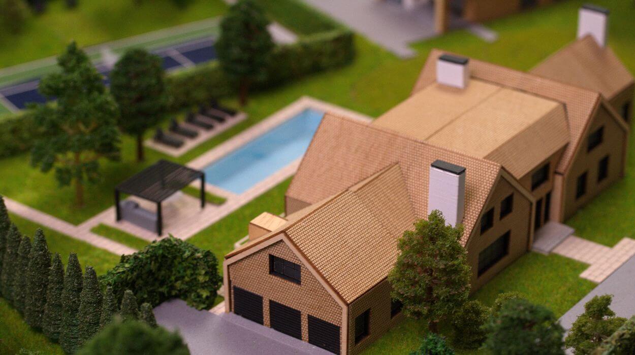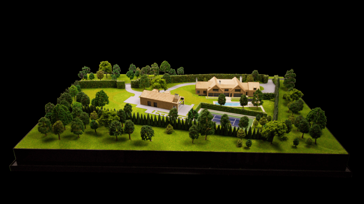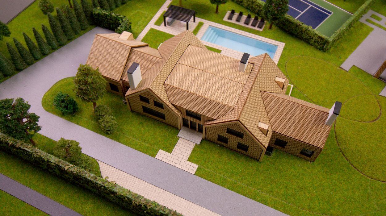 Aceasta macheta de arhitectura prezinta un domeniu rezidential, compus dintr-o vila principala si o structura secundara cu acoperis in doua ape, amplasate intr-un peisaj verde si extins. Cladirile sunt realizate cu un finisaj din lemn natural cald, completat de ferestre iluminate care creeaza o atmosfera primitoare si confortabila in contrast cu gazonul verde si arbustii ingrijiti.