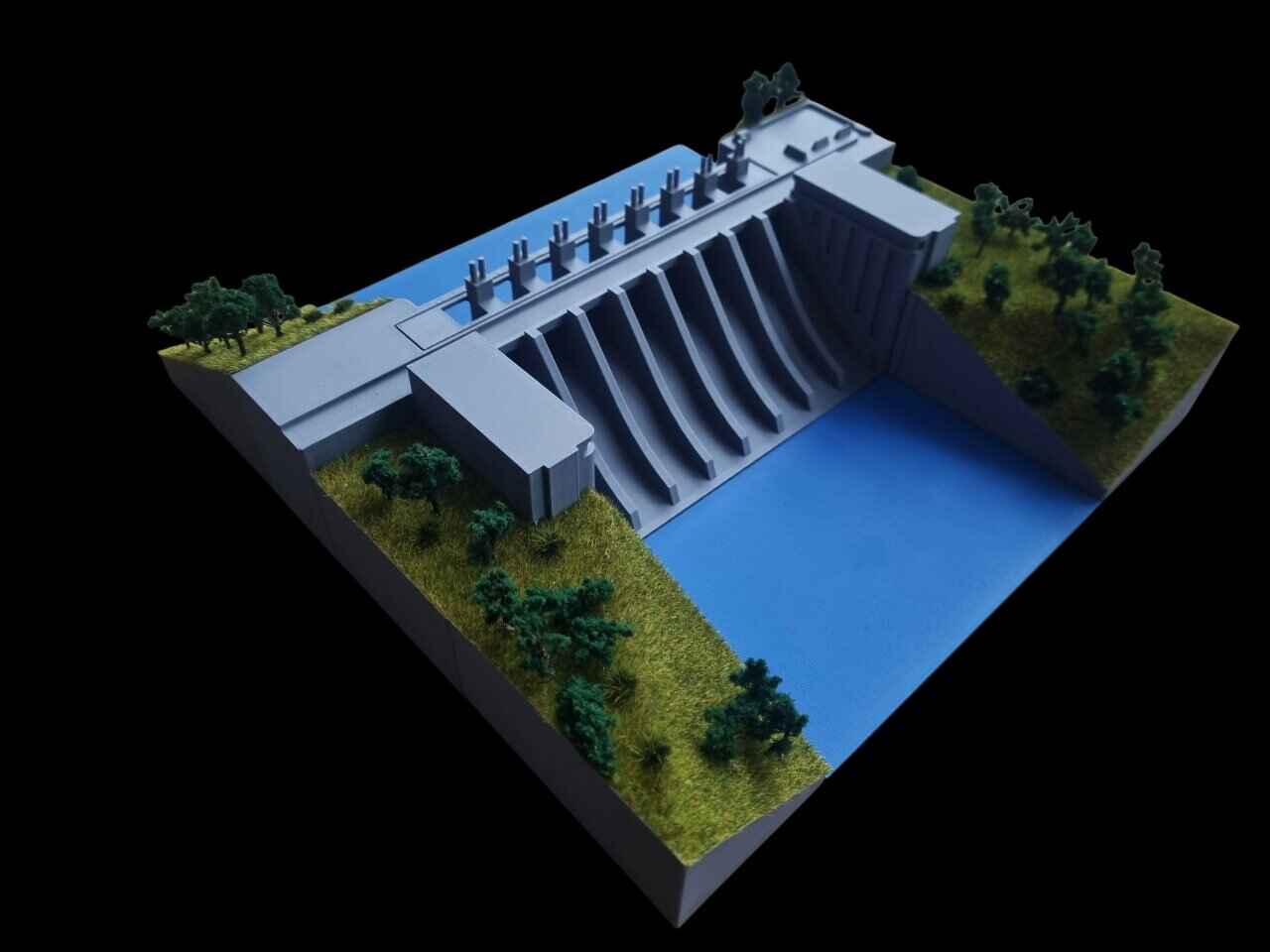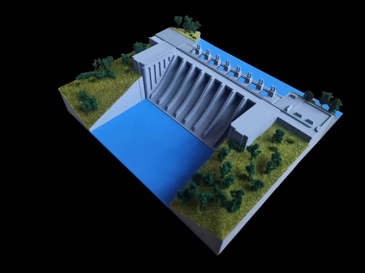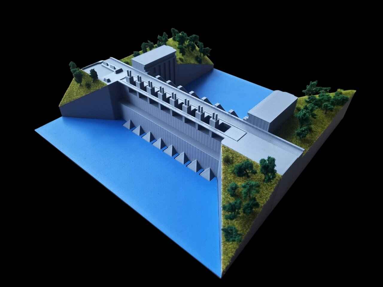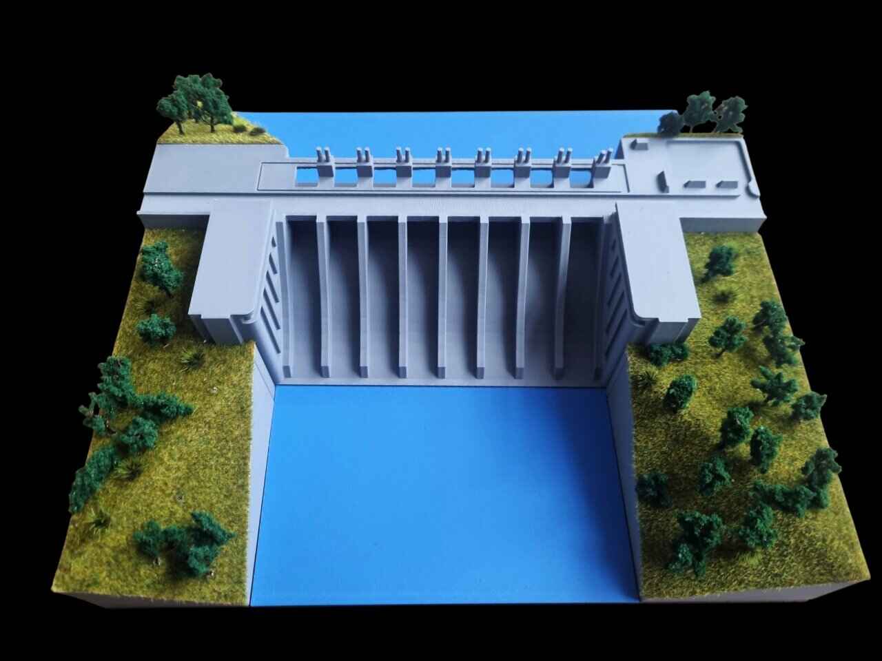 Macheta reda cu fidelitate un baraj, evidentiind deversoarele si structurile de admisie executate meticulos. Liniile geometrice curate subliniaza scara masiva si robustetea structurii originale din beton.
