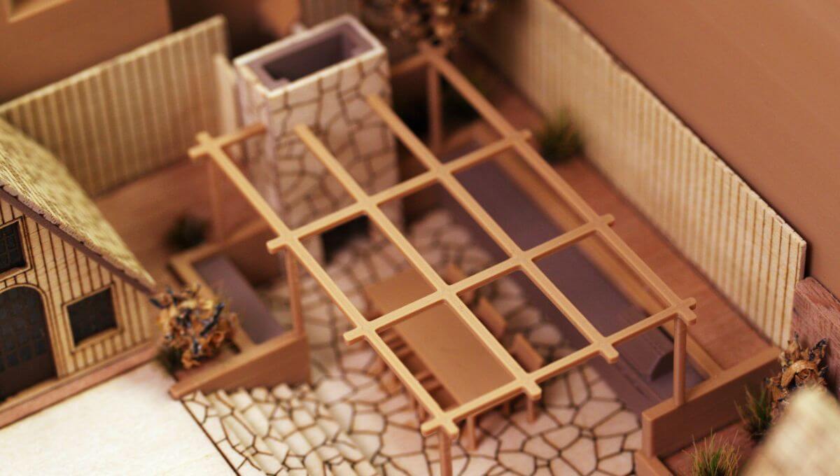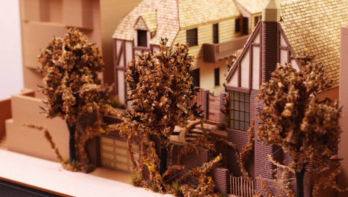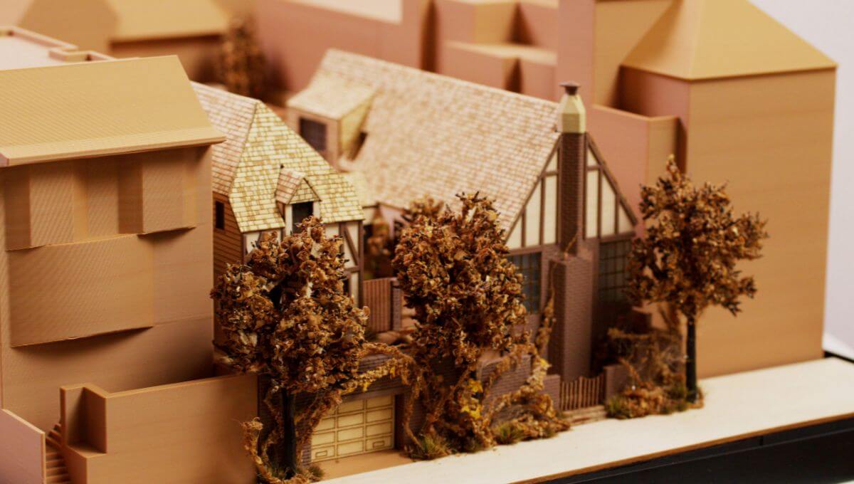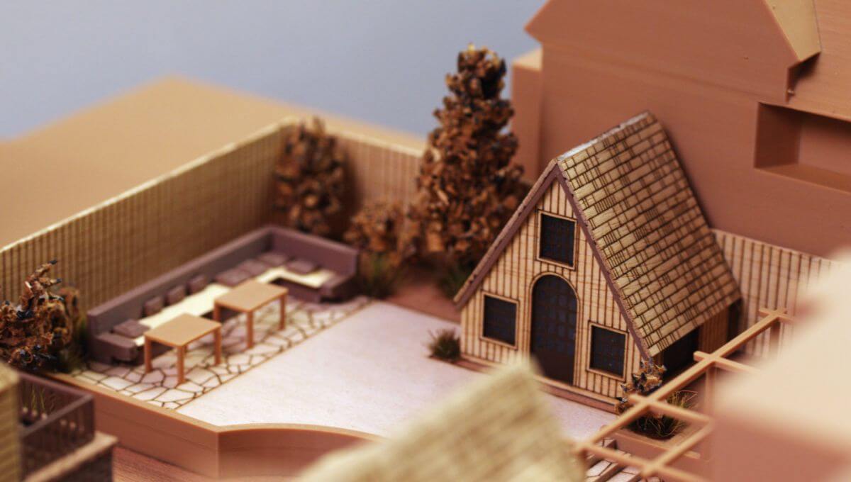 Conceptul urmărește integrarea elementelor istorice, precum acoperișurile abrupte și fațadele cu bârne aparente, într-un context rezidențial modern, definit printr-o organizare complexă a volumelor în jurul unei curți interioare private. Din punct de vedere tehnic, macheta (scara 1:50) se concentrează pe redarea fidelă a texturilor: utilizarea cartonului de diverse densități pentru structură, a furnirului pentru elementele de lemn și a materialelor compozite pentru vegetația matură.