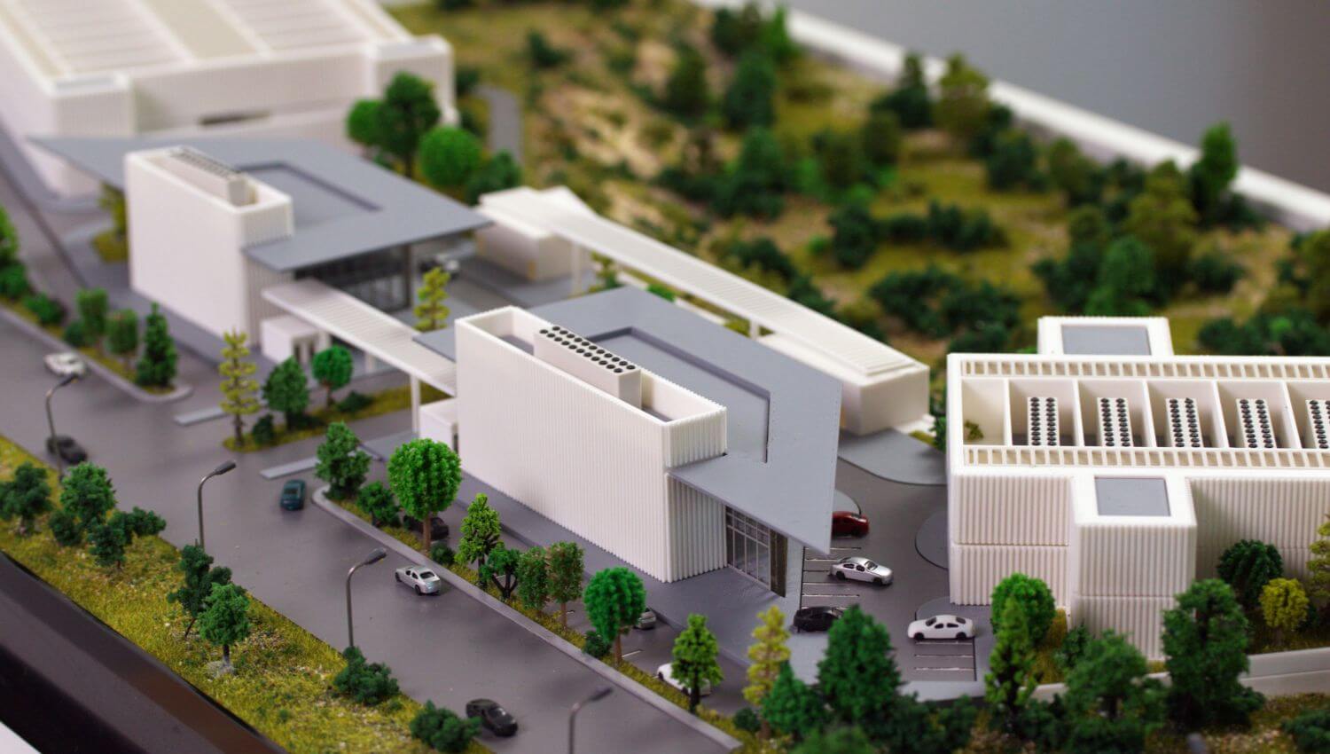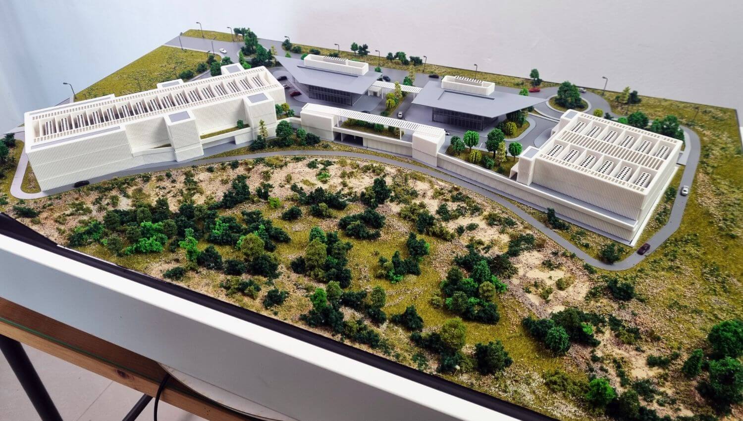 Aceasta macheta de arhitectura reprezintă un complex modern de centre de date integrat într-un mediu peisagistic. Designul evidențiază atât precizia tehnică, cât și organizarea spațială, cu o dispunere care pune accent pe eficiență, securitate și funcționalitate.
