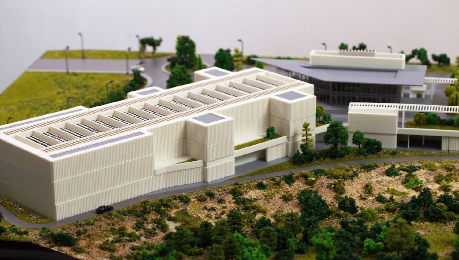Exteriorul este înconjurat de o amenajare peisagistică realistă, completă cu copaci, drumuri și zone de parcare, ilustrând eficient modul în care instalația se îmbină cu împrejurimile sale naturale. Topografia curbată a amplasamentului și dispunerea pe mai multe niveluri demonstrează modul în care clădirea se adaptează la terenul în pantă.