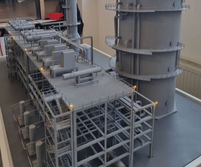 Macheta prezintă principalele turnuri de procesare, sistemele de conducte, schimbătoarele de căldură și platformele de întreținere, evidențiind designul modular și precizia inginerească a instalației.